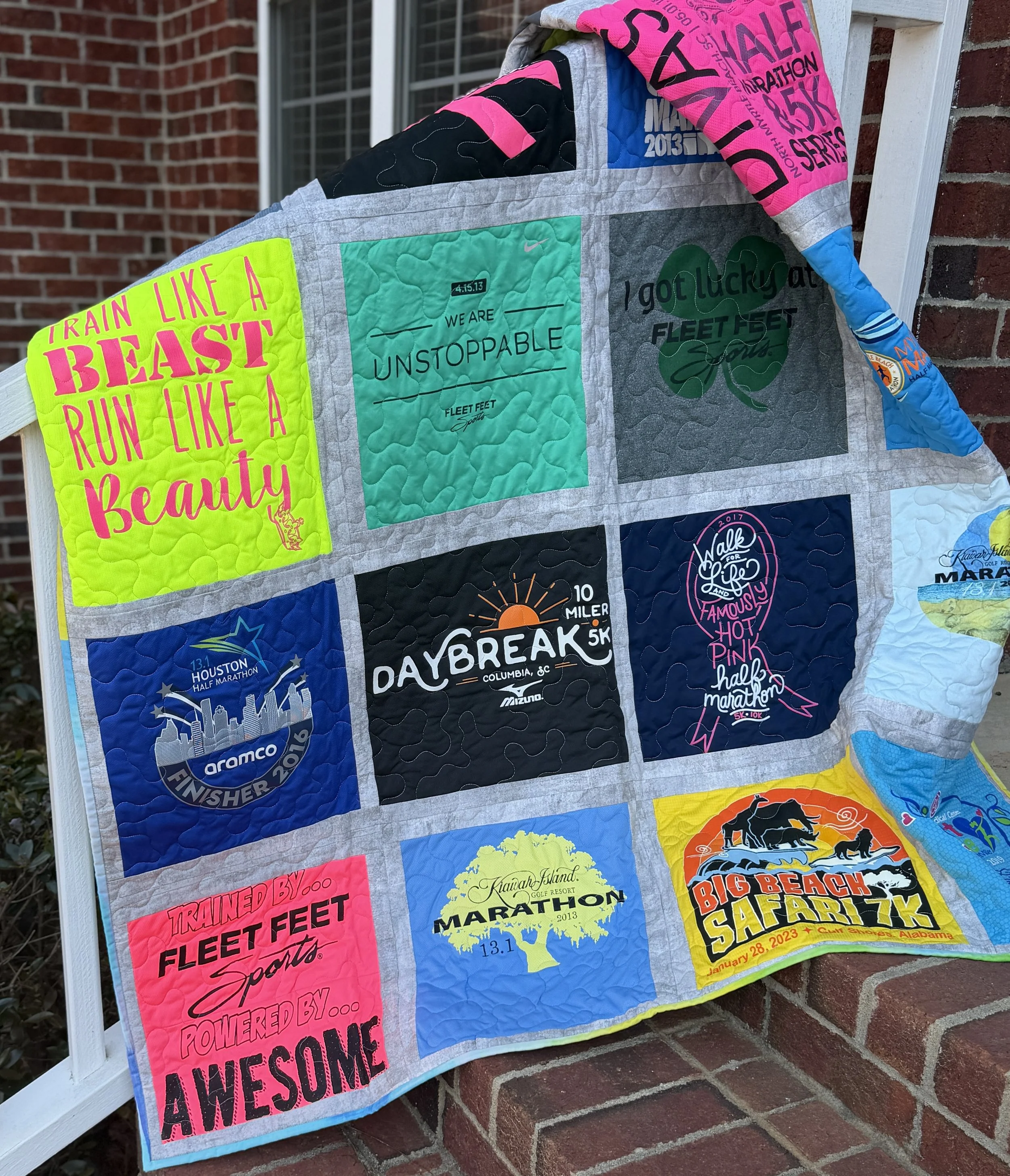 Turn your favorite shirts into a lasting, personalized quilt that tells your story. Needle on the Run specializes in handcrafted t-shirt quilts made from the tees that hold your memories—concert shirts, sports jerseys, college apparel, race shirts, band merch, and more. Each quilt is carefully designed to preserve logos, artwork, and text, using a thoughtful layout, premium quilt cotton fabric and high-quality stabilizer and batting materials to ensure warmth, and longevity.